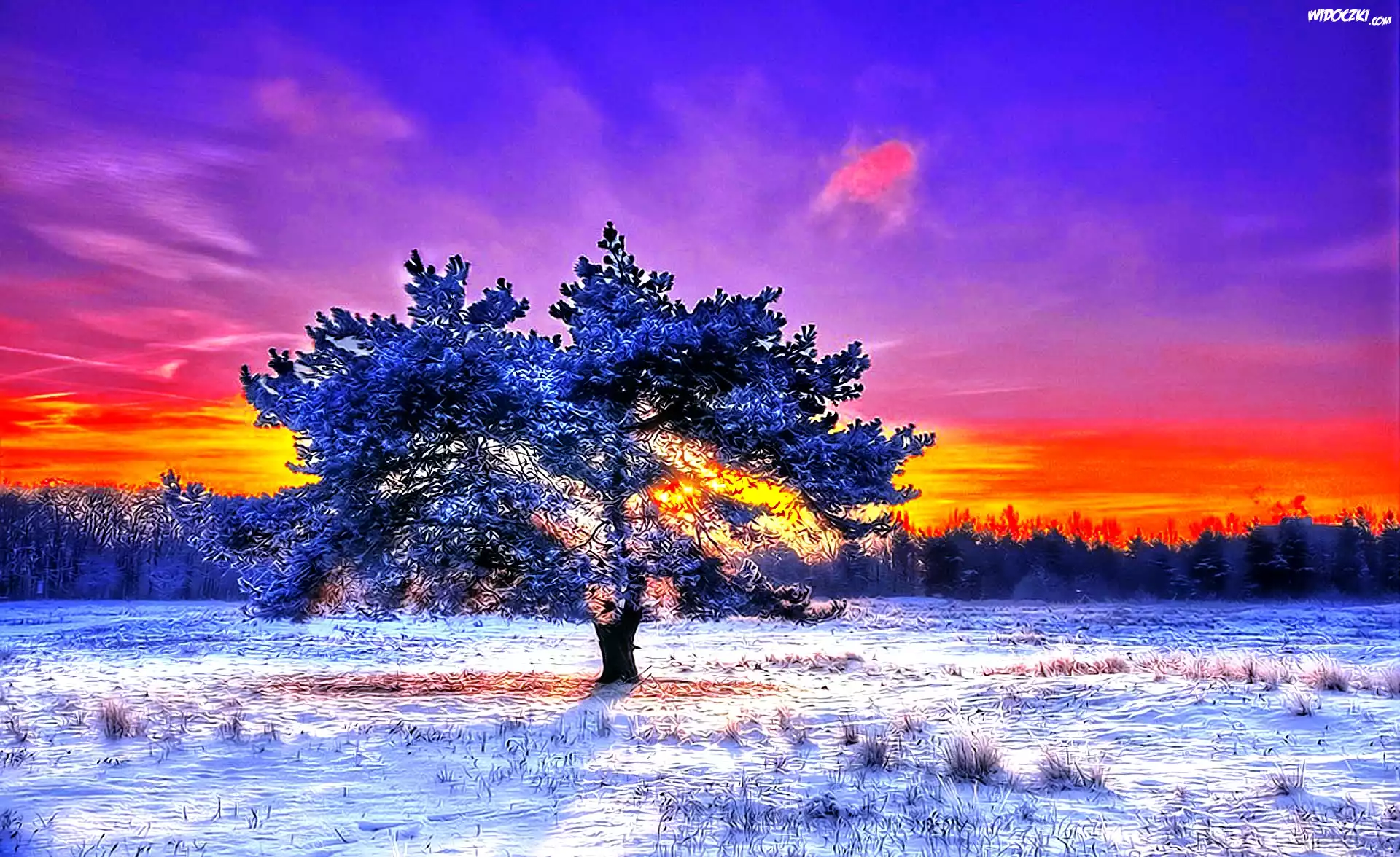Zdjęcia, Zachód, Słońca, Drzewo, Śnieg