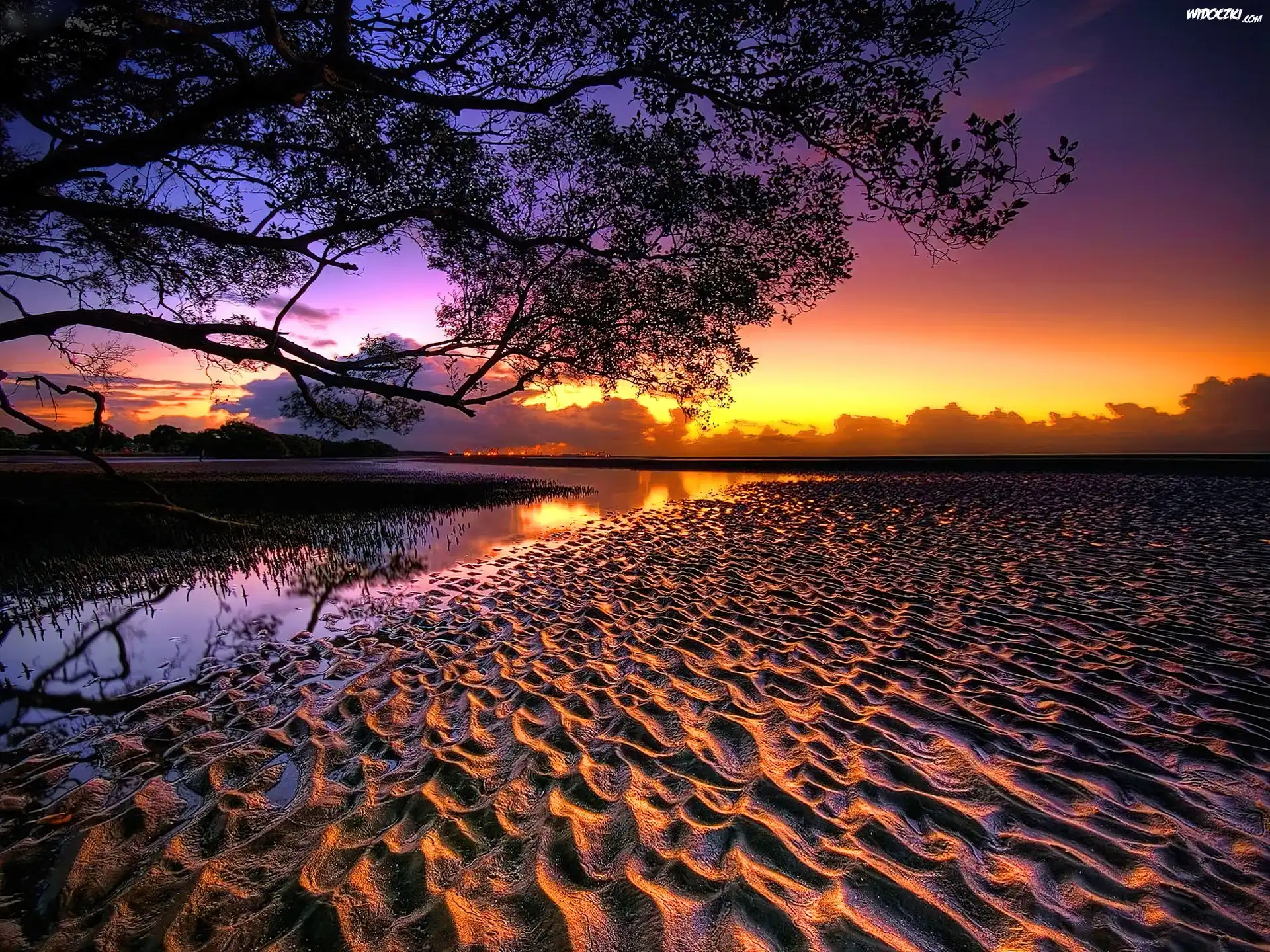 Zdjęcia, Zachód, Słońca, Drzewo, Plaża