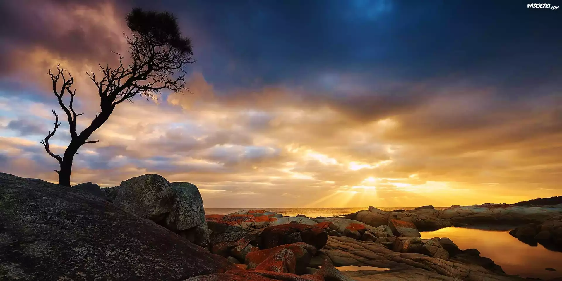 Zdjęcia, Zachód, Słońca, Drzewo, Skały