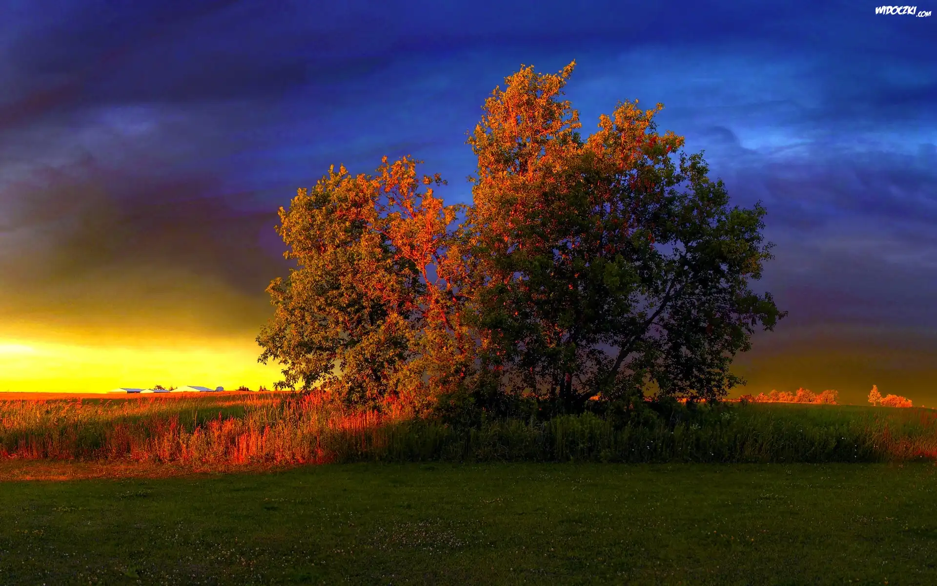 Zdjęcia, Zachód, Słońca, Drzewo, Trawa