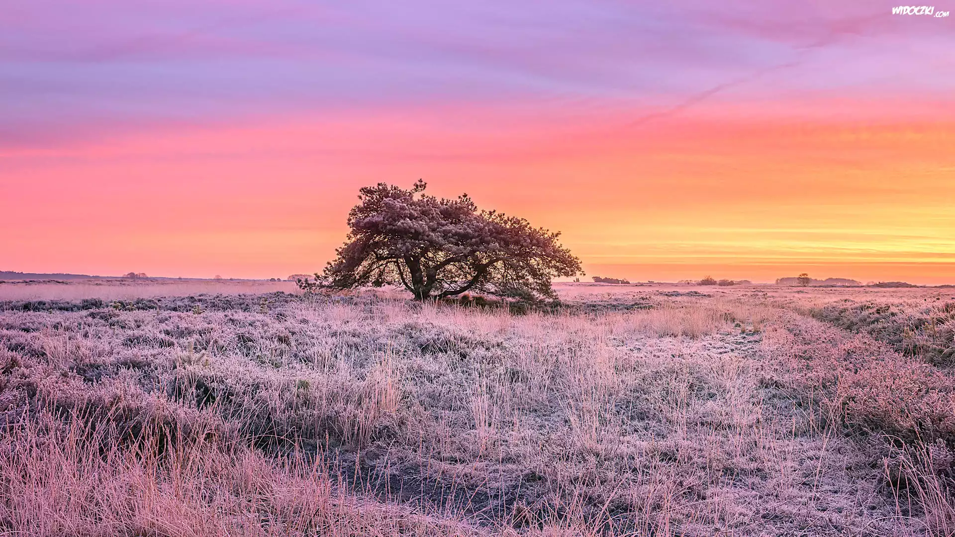 Zachód słońca, Wrzosowisko, Drzewo, Szron