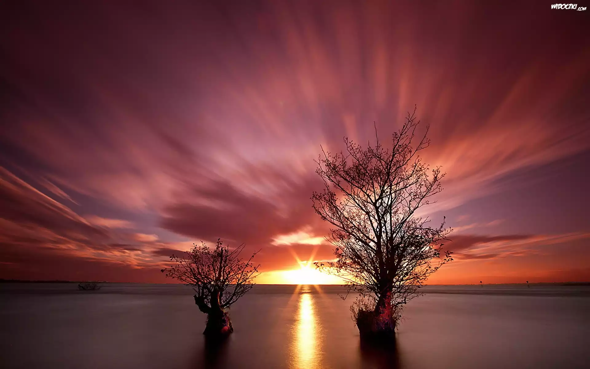 Zdjęcia, Zachód, Słońca, Dwa, Drzewa