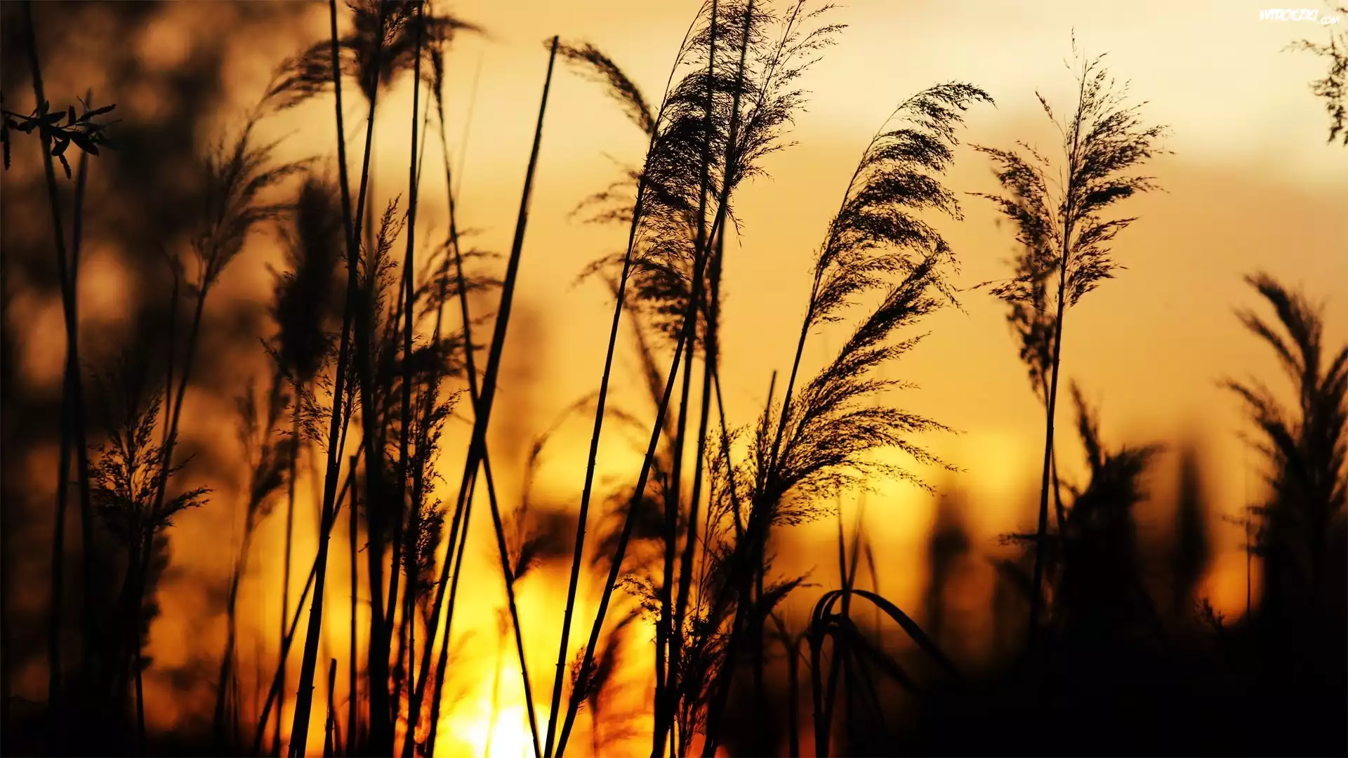 Zdjęcia, Zachód słońca, Źdźbła, Trawy