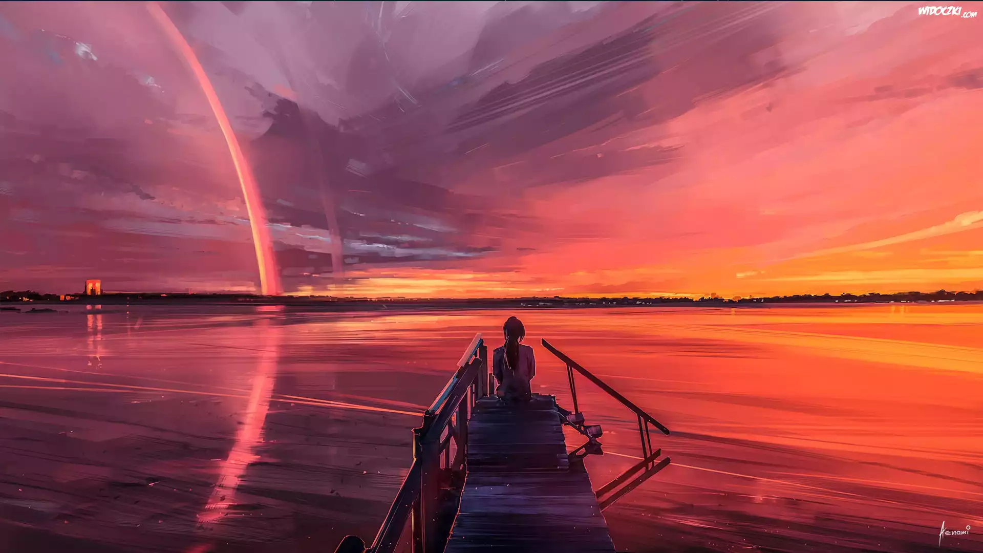 Zachód słońca, Morze, Pomost, Dziewczyna, Grafika