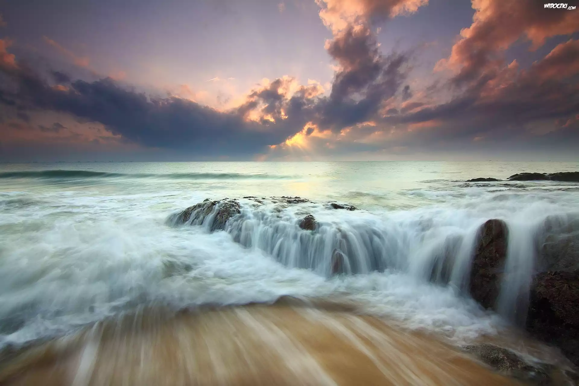 Zdjęcia, Zachód, Słońca, Morze, Fale, Kamienie