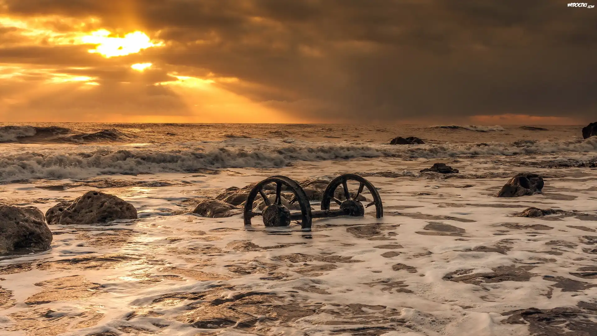 Zdjęcia, Zachód, Słońca, Morze, Fale, Kamienie