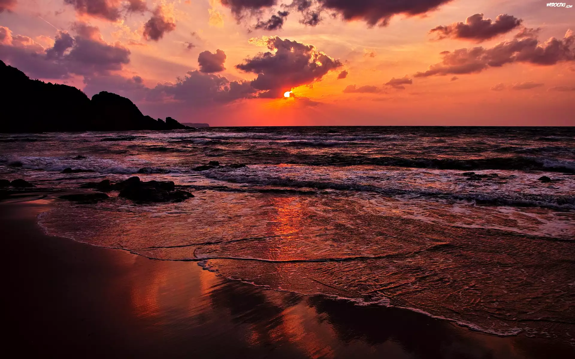 Zdjęcia, Zachód, Słońca, Morze, Fale, Plaża