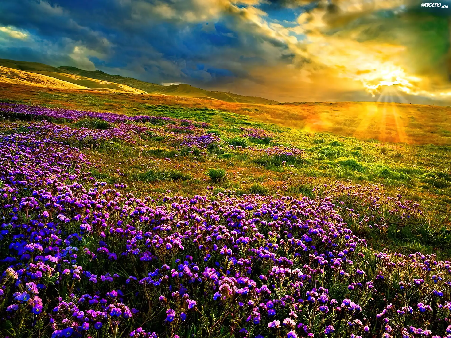 Zdjęcia, Zachód, Słońca, Łąka, Fioletowe, Kwiatuszki