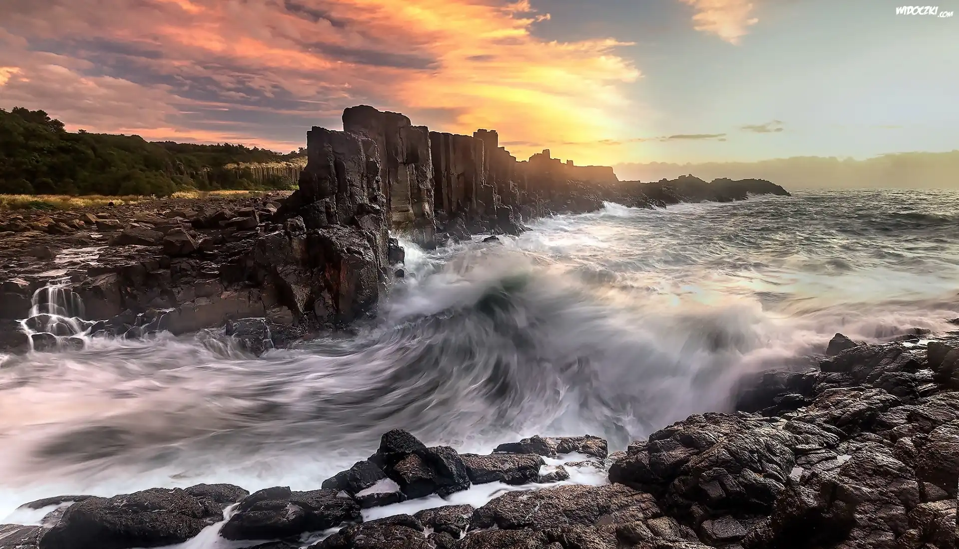 Zachód słońca, Morze, Formacja skalna, Bombo Headland Quarry, Skały, Drzewa, Bombo, Kiama, Australia |