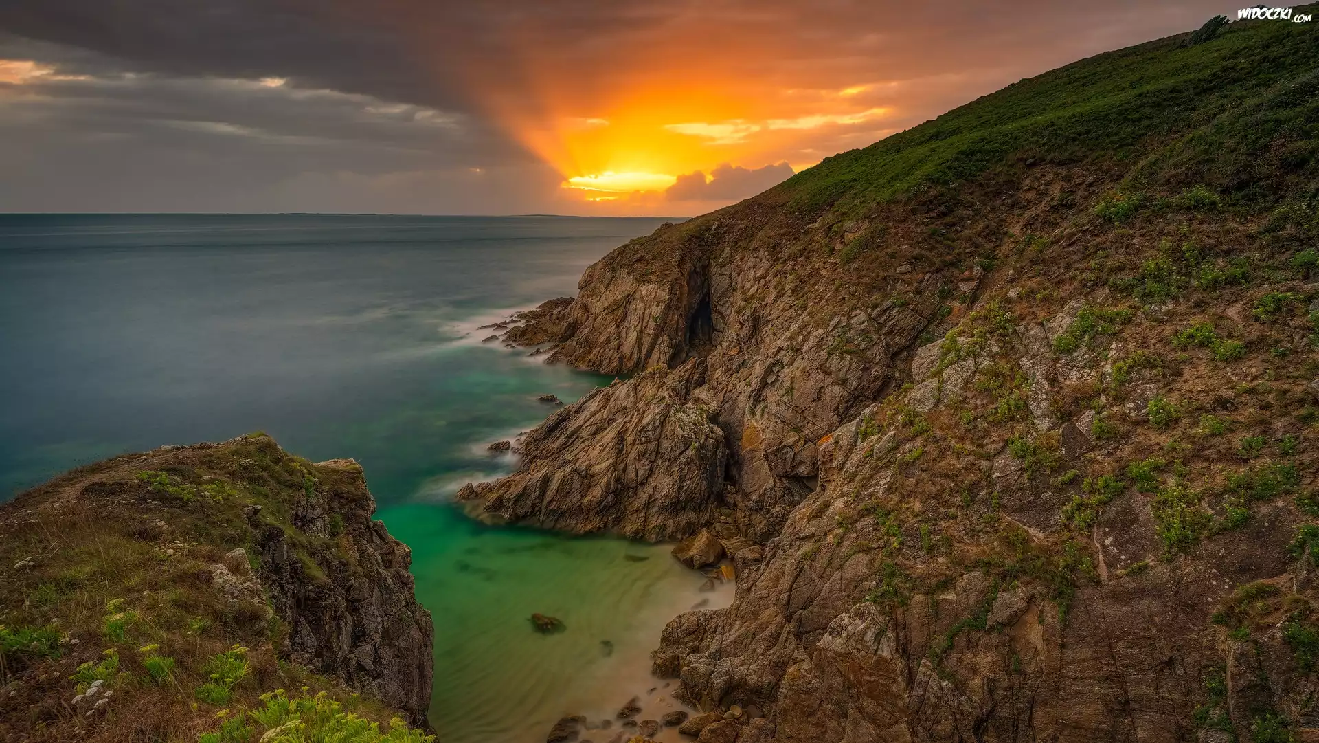 Morze, Zachód słońca, Wybrzeże, Skały, Rośliny, Bretania, Francja