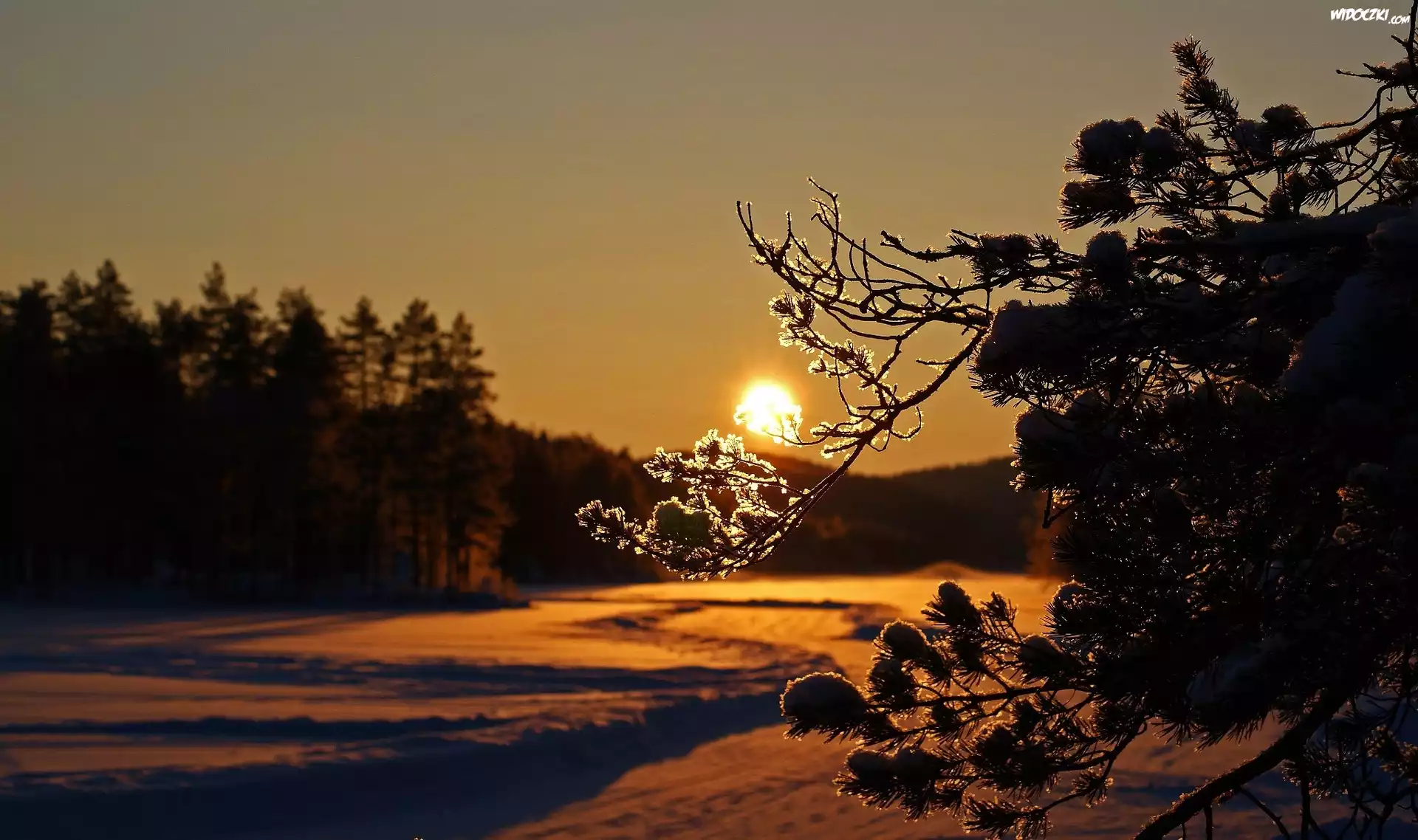 Zdjęcia, Zachód, Słońca, Las, Gałązka, Zima