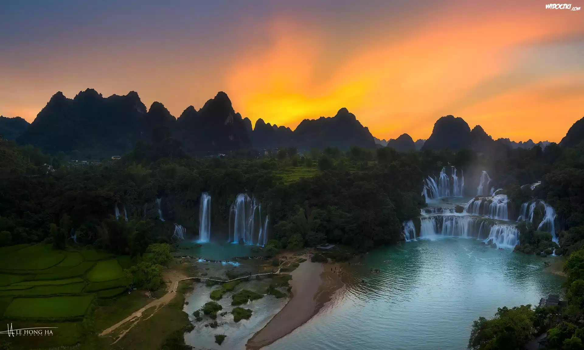 Zdjęcia, Wodospad, Ban Gioc Waterfall, Jezioro, Rzeka, Cao Bang, Góry, Zachód słońca, Wietnam