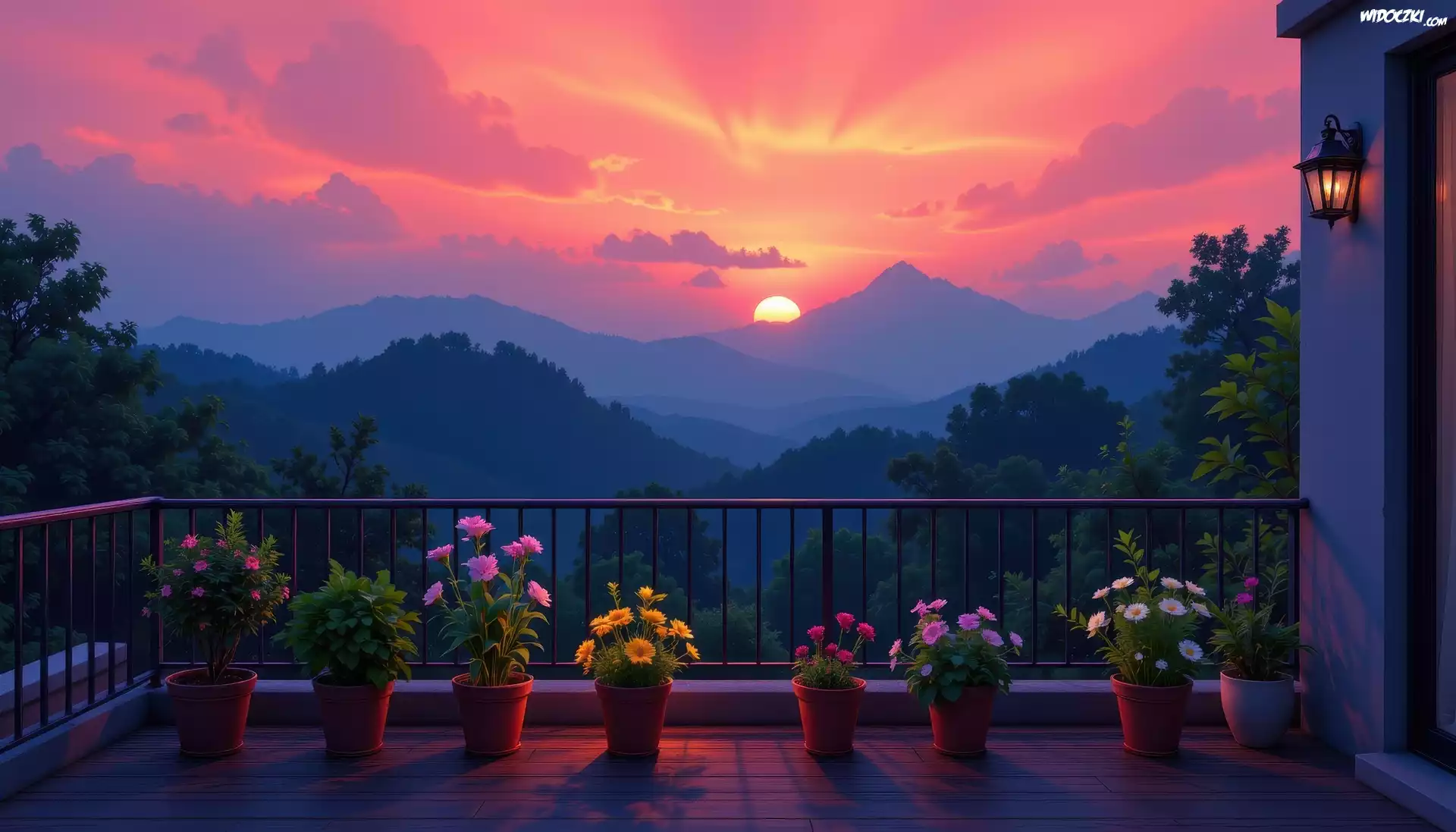 Zdjęcia, Kwiaty, Doniczki, Balkon, Zachód słońca, Góry