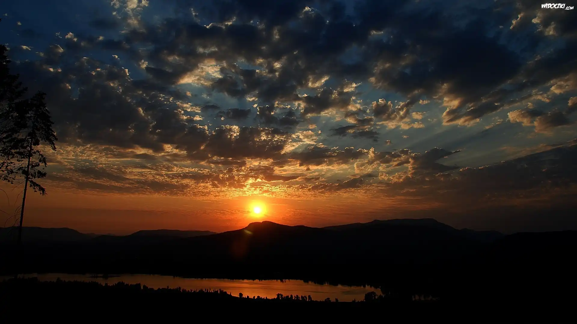 Zachód, Słońca, Chmury, Góry, Jezioro