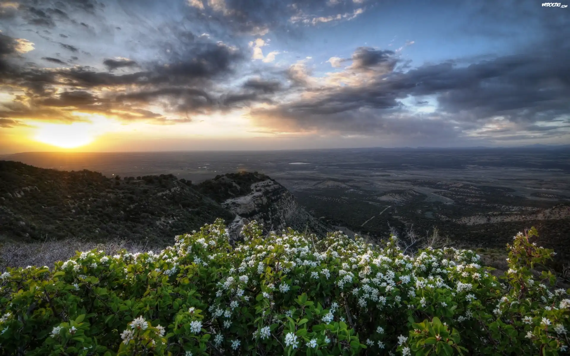 Zachód, Słońca, Chmury, Góry, Kwiaty