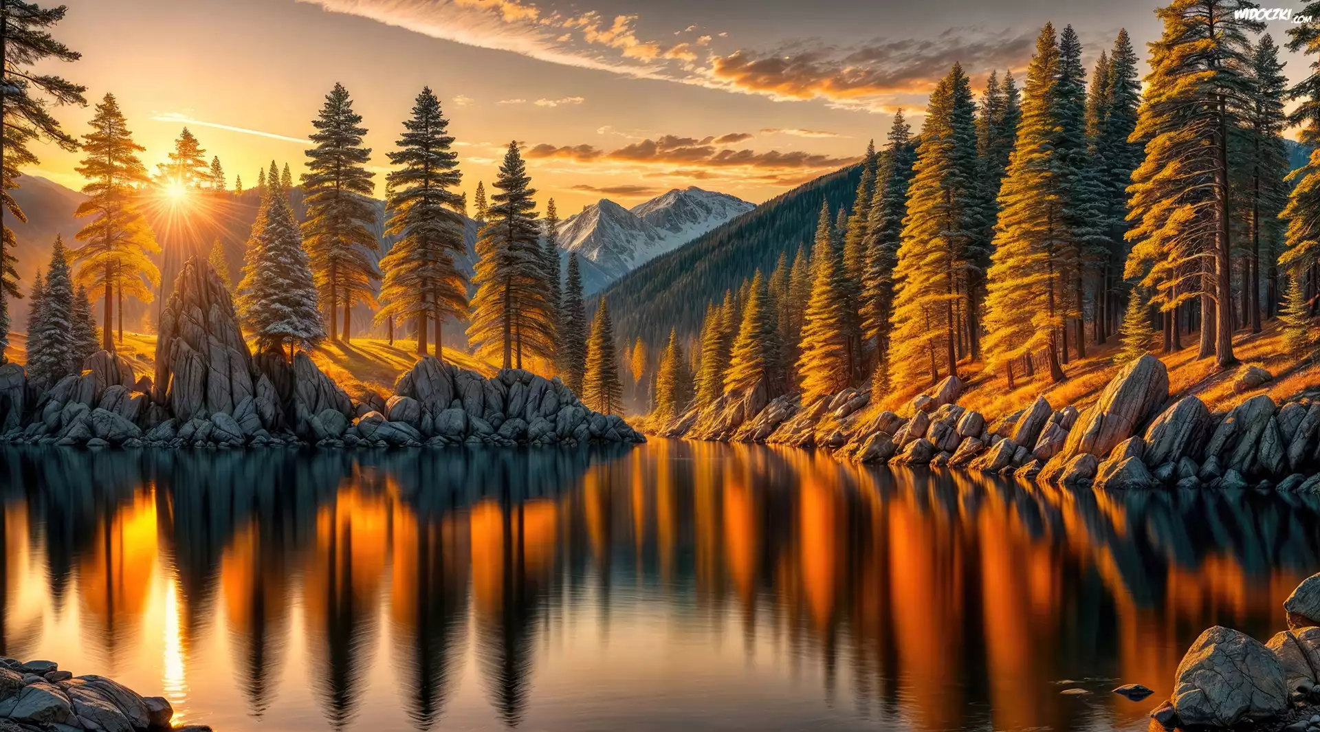 Jezioro, Drzewa, Góry, Zachód słońca, Jesień, Grafika