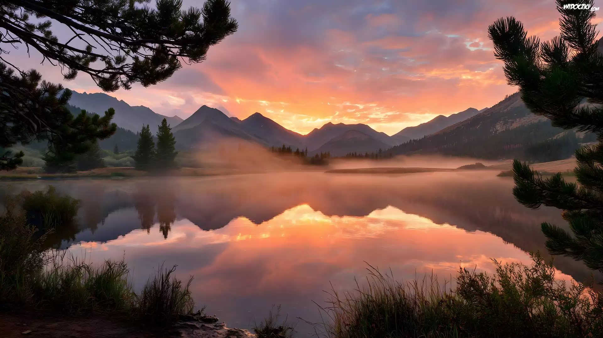 Góra Jezioro, Mgła, Drzewa Zachód Słońca, Chmura, Góra Zachód Słońca, Chmury Góra Góra Spokojne Morze, Zachód Słońca Góra Góra Góra, Jeziora Zachód Słońca, Latarnia, Most Jezioro, Zielona, Trawa, Drzewa Góra, Zima Palmy, Zachód Słońca