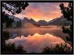Zdjęcia, Gałęzie, Jezioro, Góry, Zachód słońca, Grafika AI