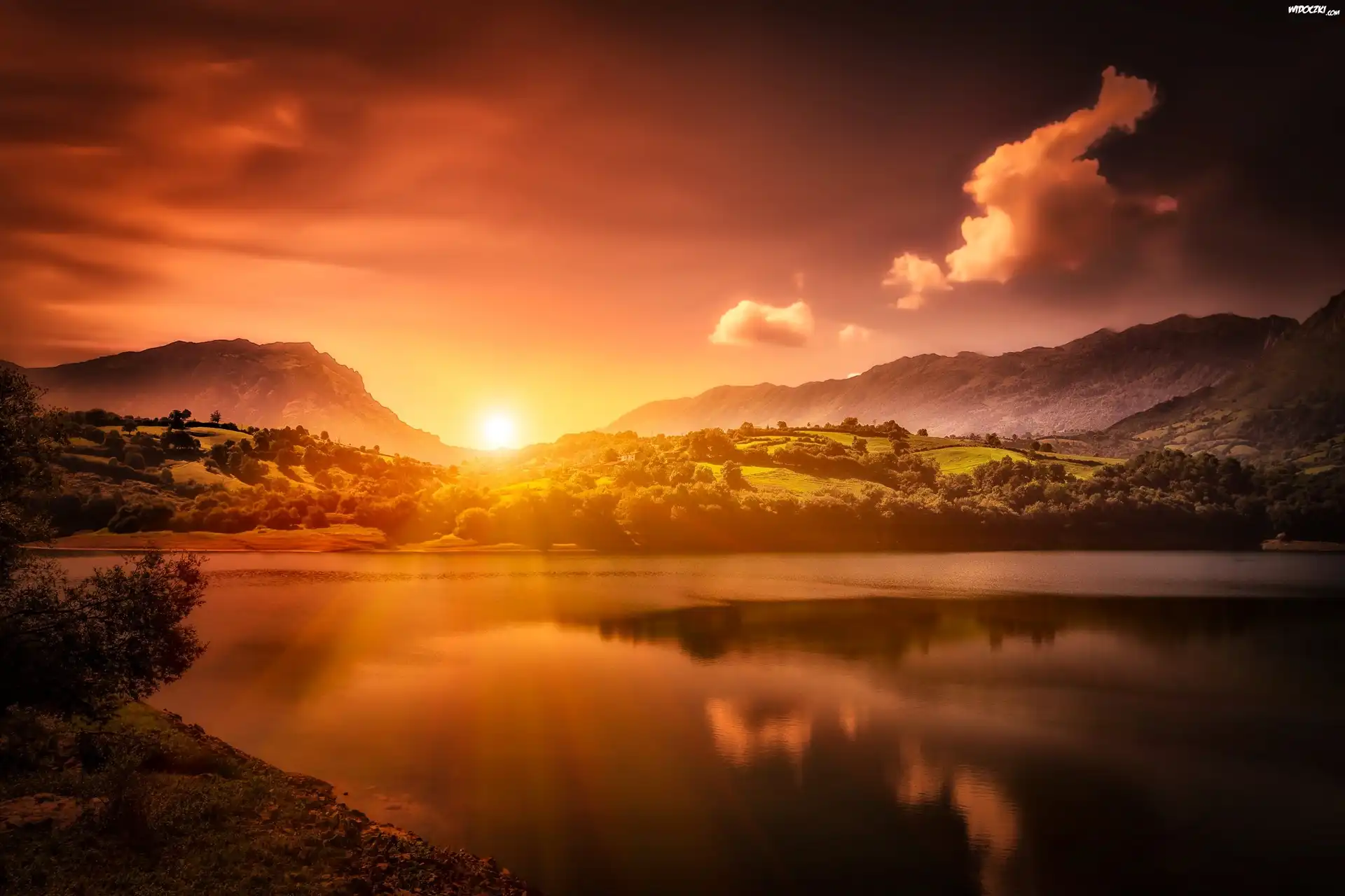 Zdjęcia, Zachód Słońca, Jezioro, Góry, Odbicie