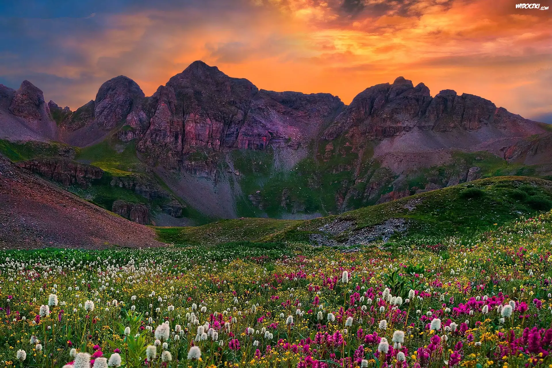 Kwiaty, Łąka, Góry, Zachód słońca, Kolorowe, Niebo