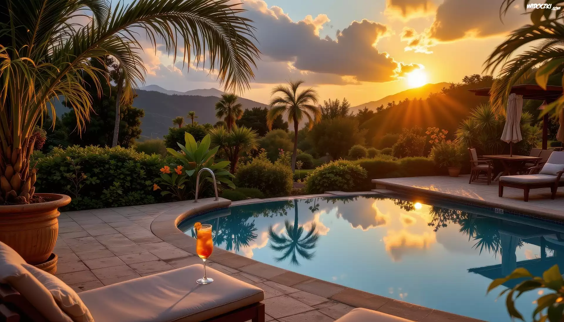 Basen, Palmy, Leżaki, Zachód słońca, Góry
