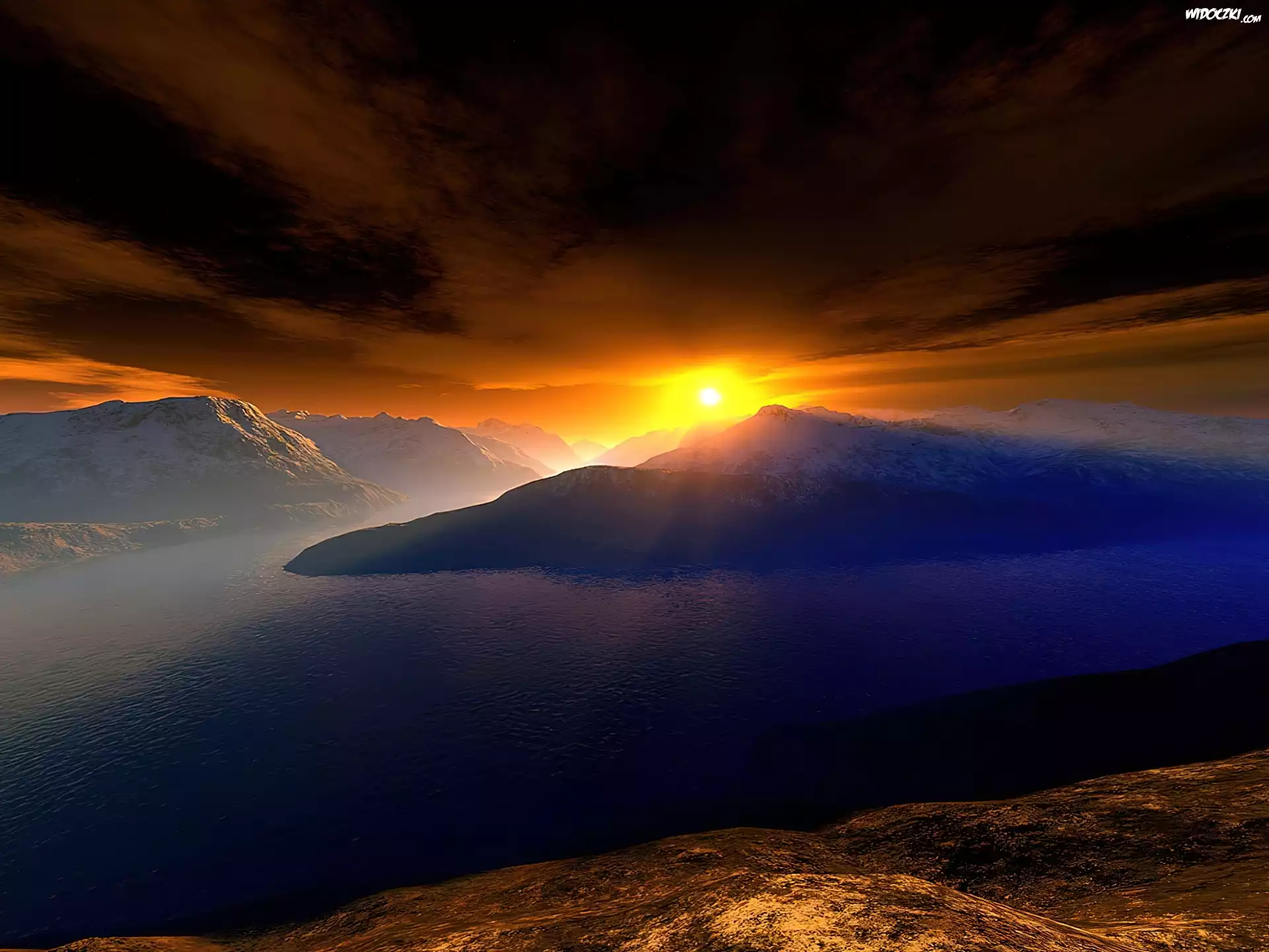 Zdjęcia, Zachód, Słońca, Morze, Góry, Niebo