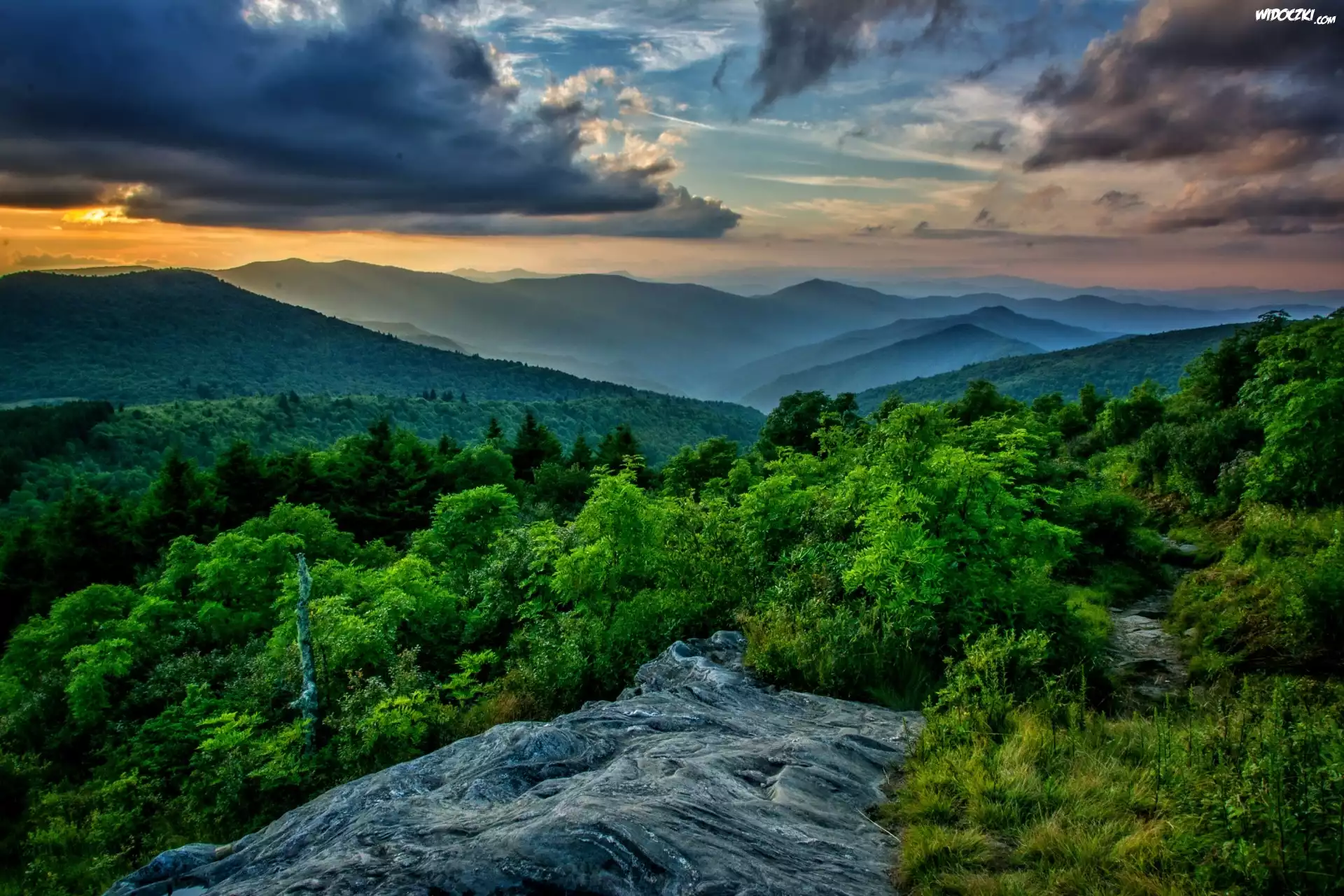 Góry, Zachód, Słońca, Skały, Roślinność, Błękit, Niebo