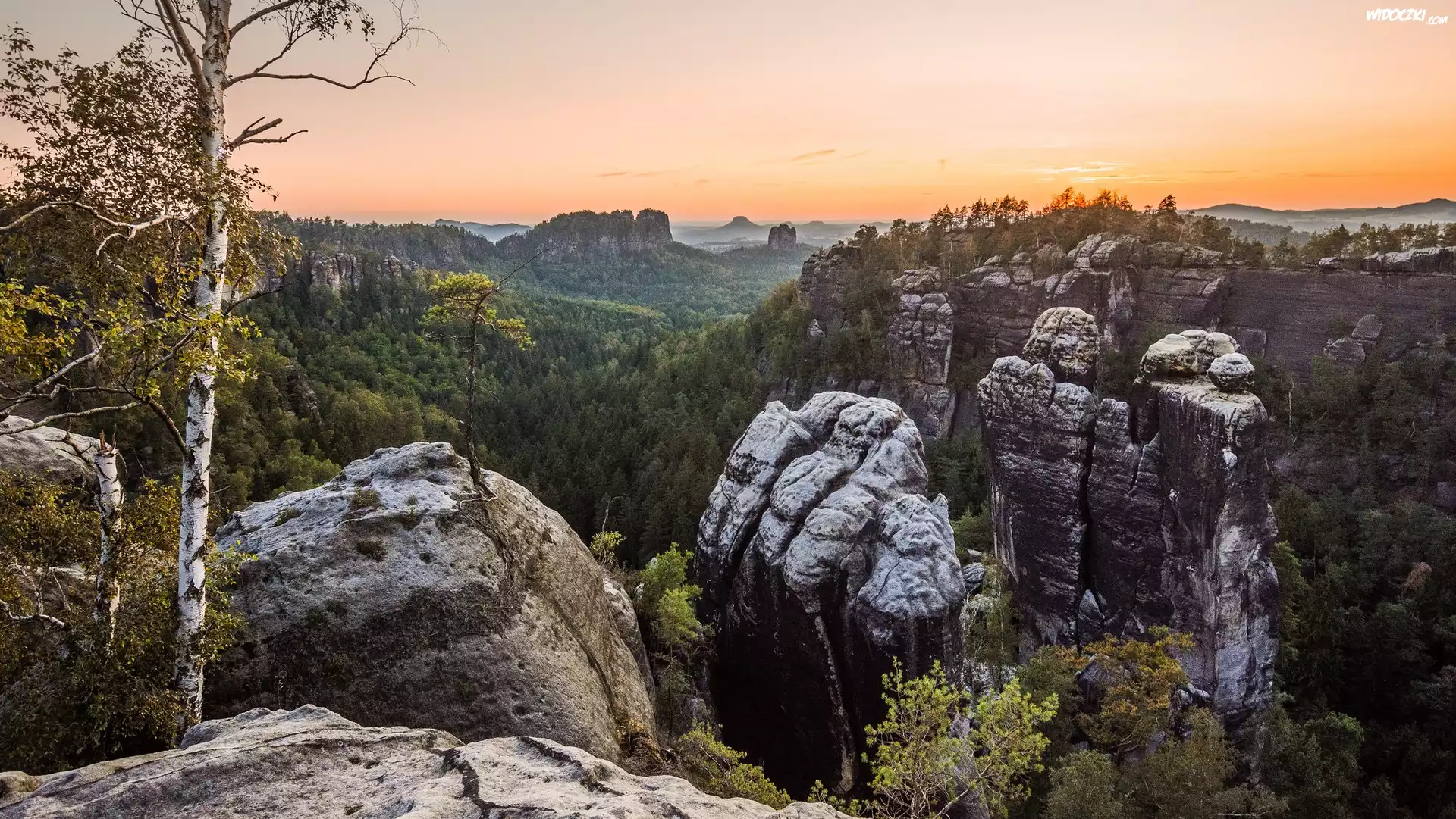 Zdjęcia, Góry Połabskie, Skały, Bastei, Drzewa, Zachód słońca, Park Narodowy Saskiej Szwajcarii, Niemcy