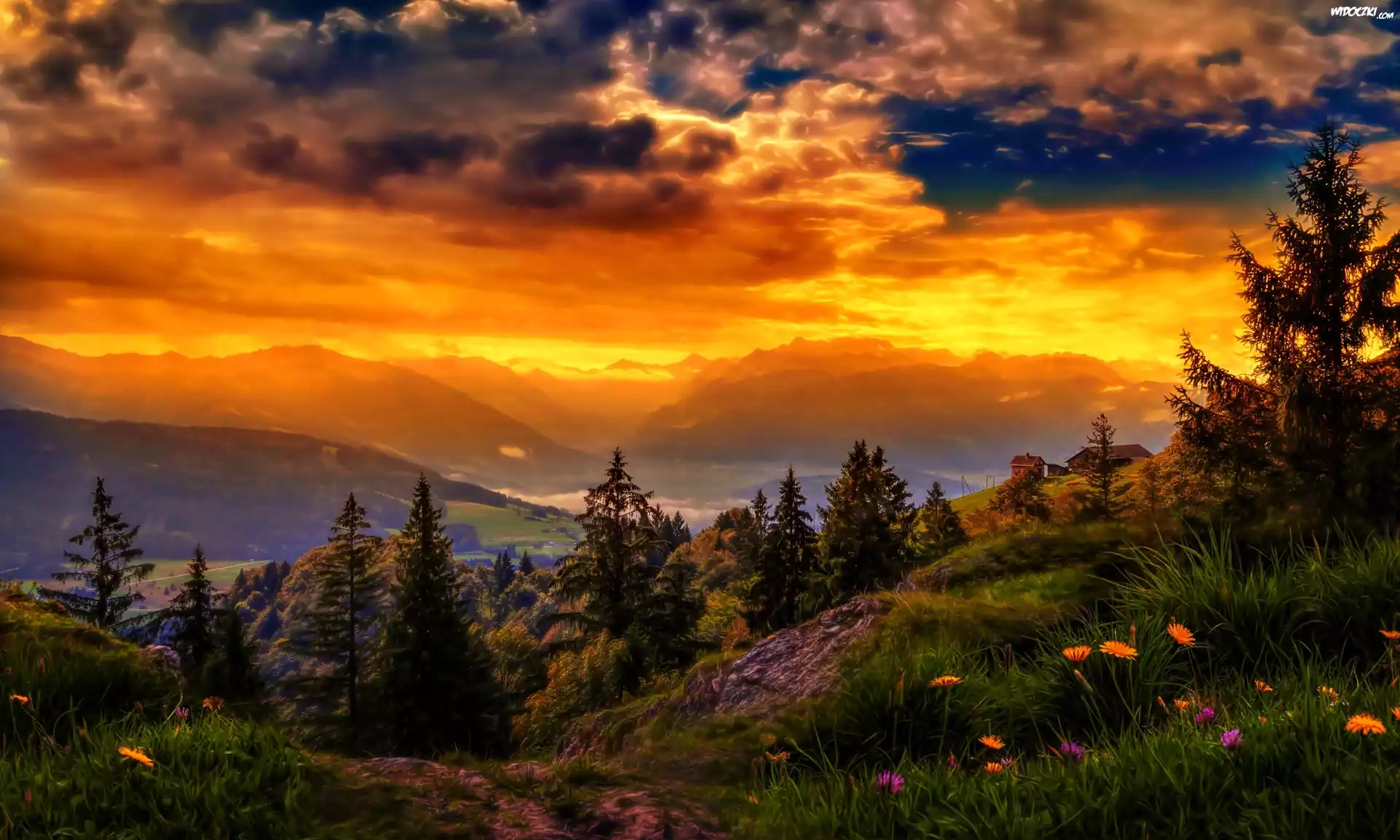 Zdjęcia, Zachód, Słońca, Góry, Drzewa