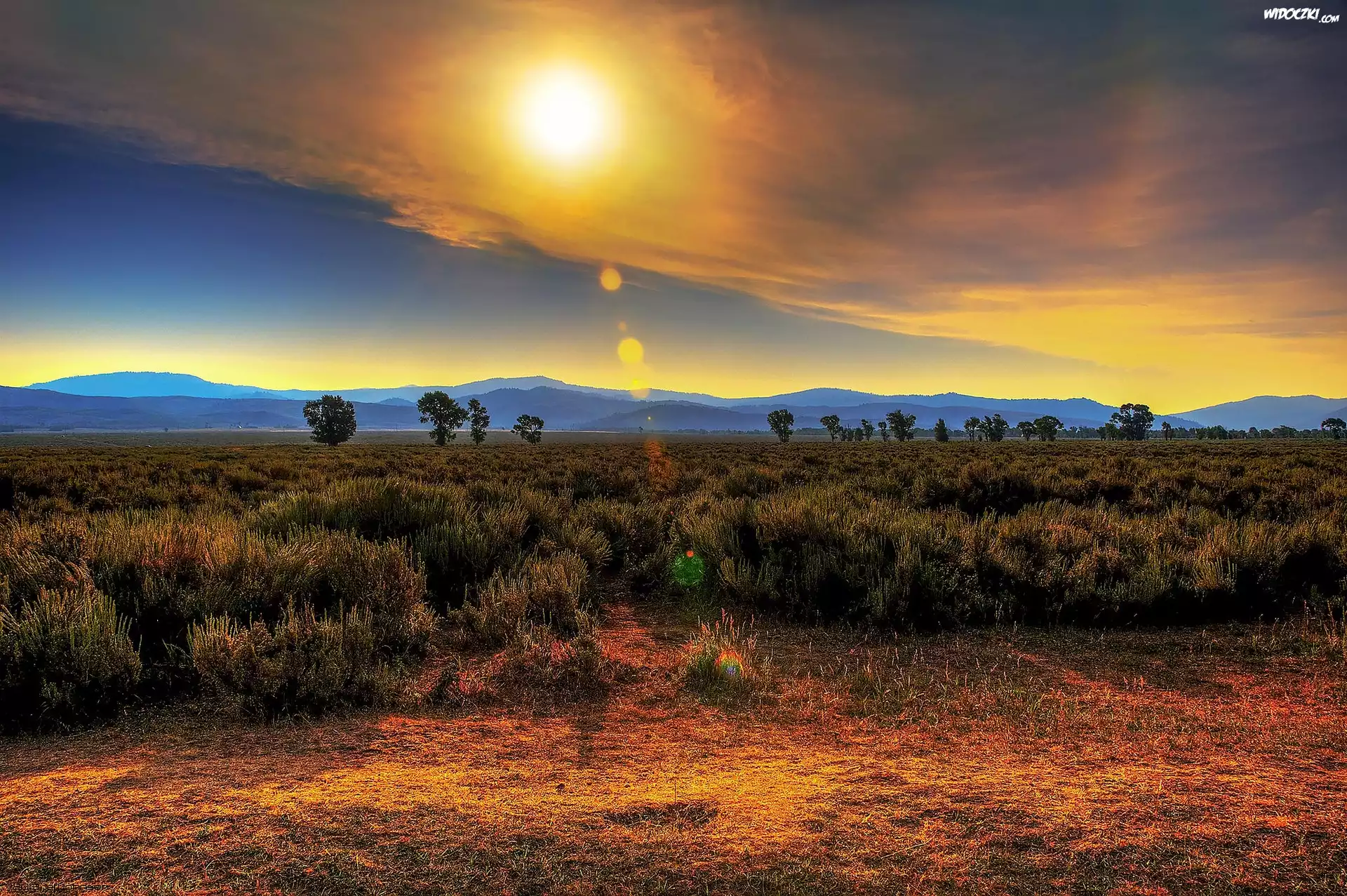 Zdjęcia, Zachód, Słońca, Góry, Krzewy