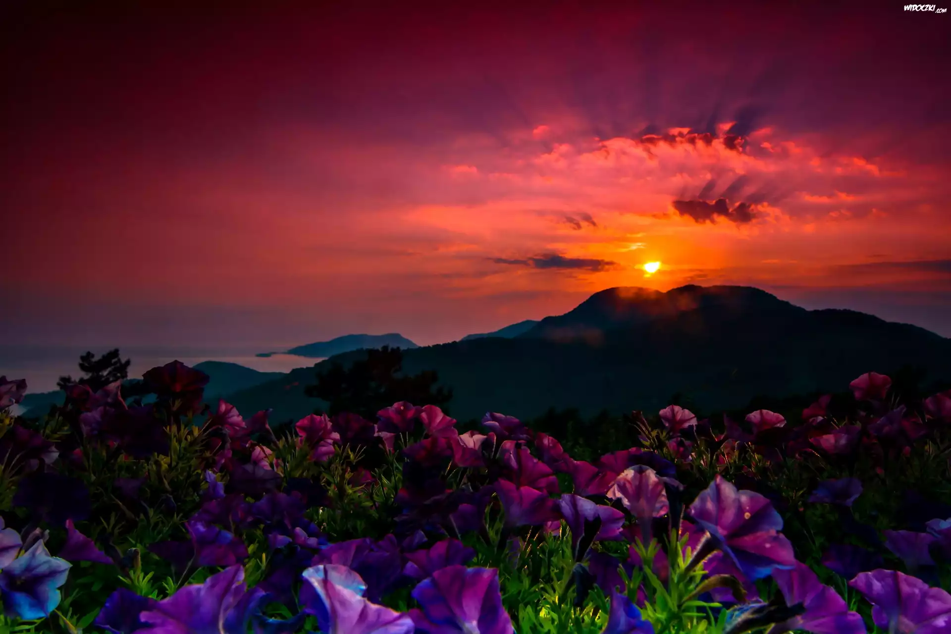 Zdjęcia, Zachód słońca, Góry, Kwiaty