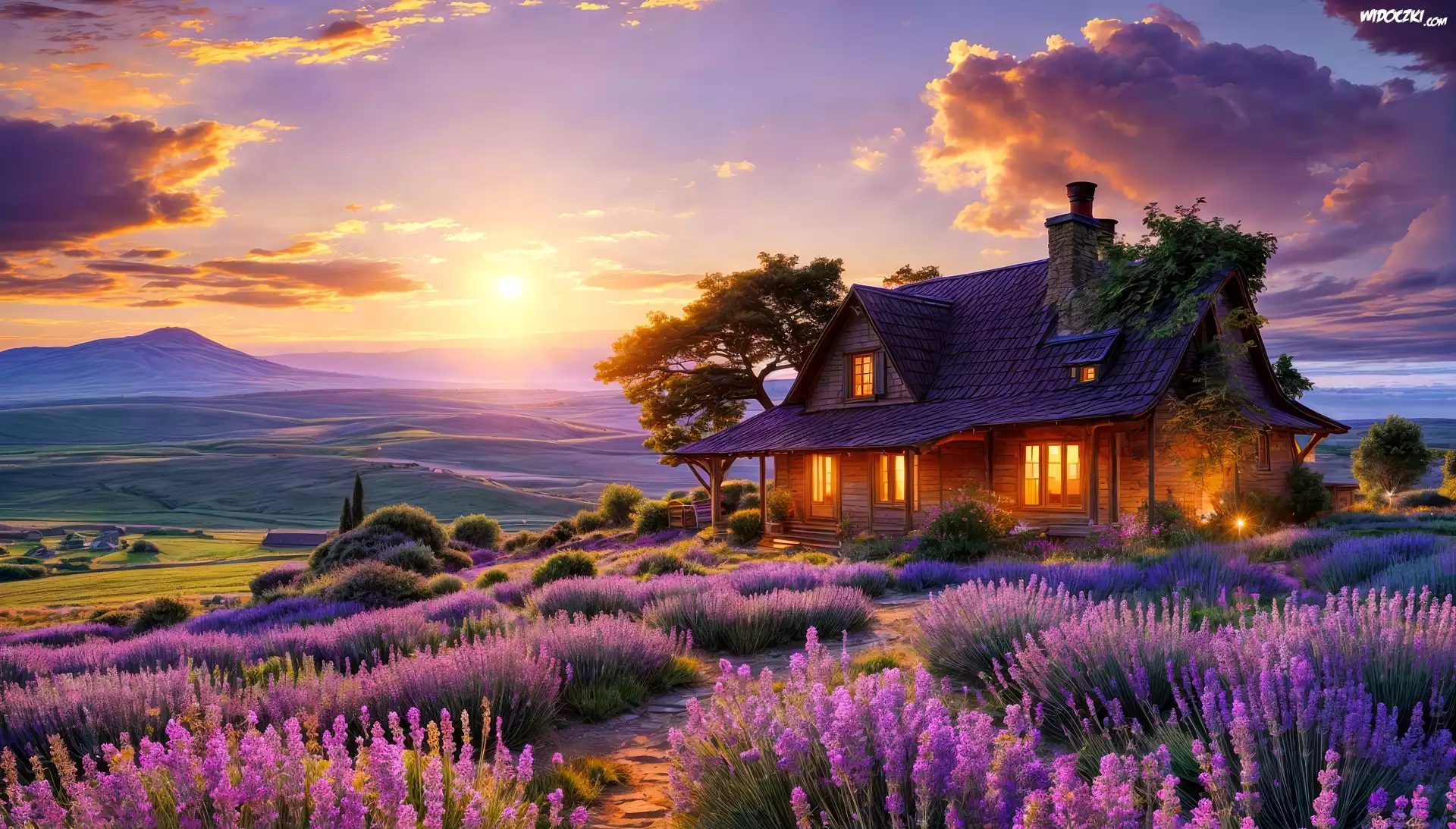 Lawenda, Oświetlony, Dom, Zachód słońca, Grafika