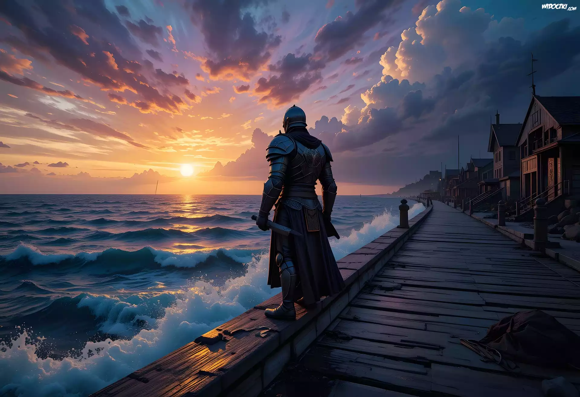 Morze, Rycerz, Domy, Zachód słońca, Grafika