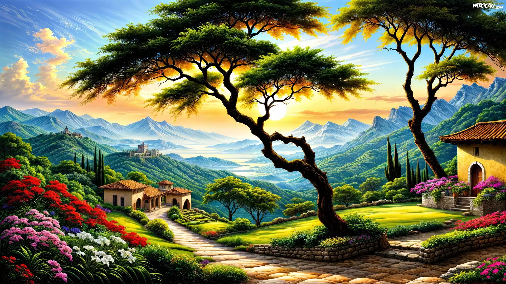 Zdjęcia, Drzewa, Domy, Góry, Zachód słońca, Grafika