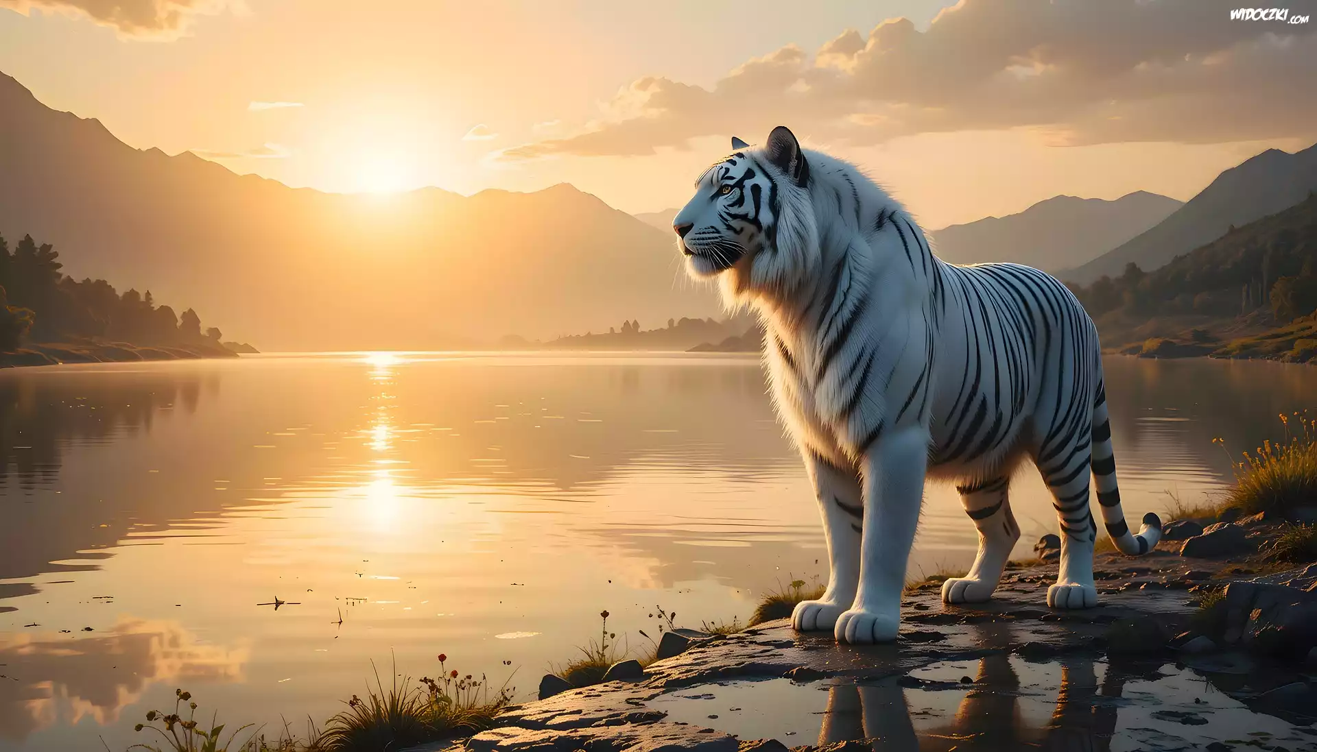 Biały, Tygrys, Jezioro, Zachód słońca, Grafika