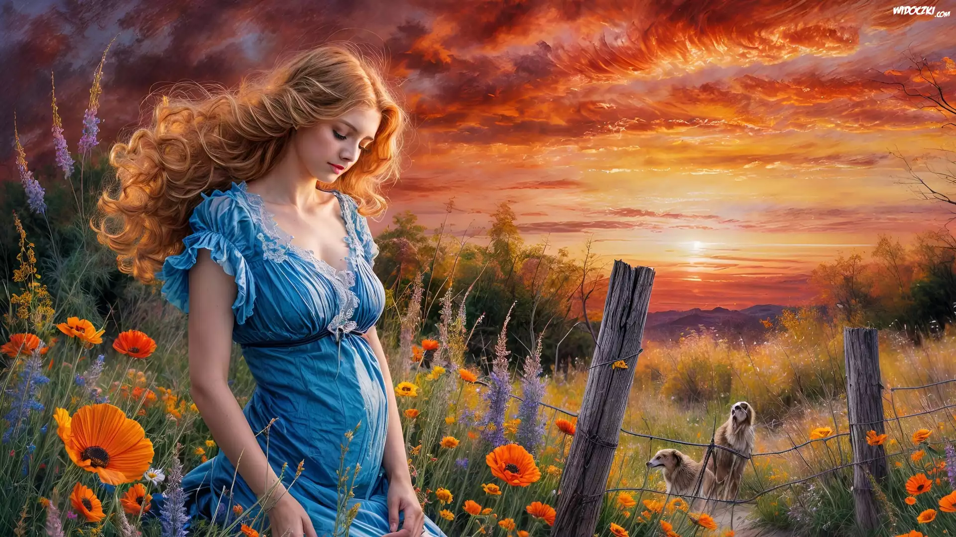 Kobieta, Łąka, Kwiaty, Zachód słońca, Grafika