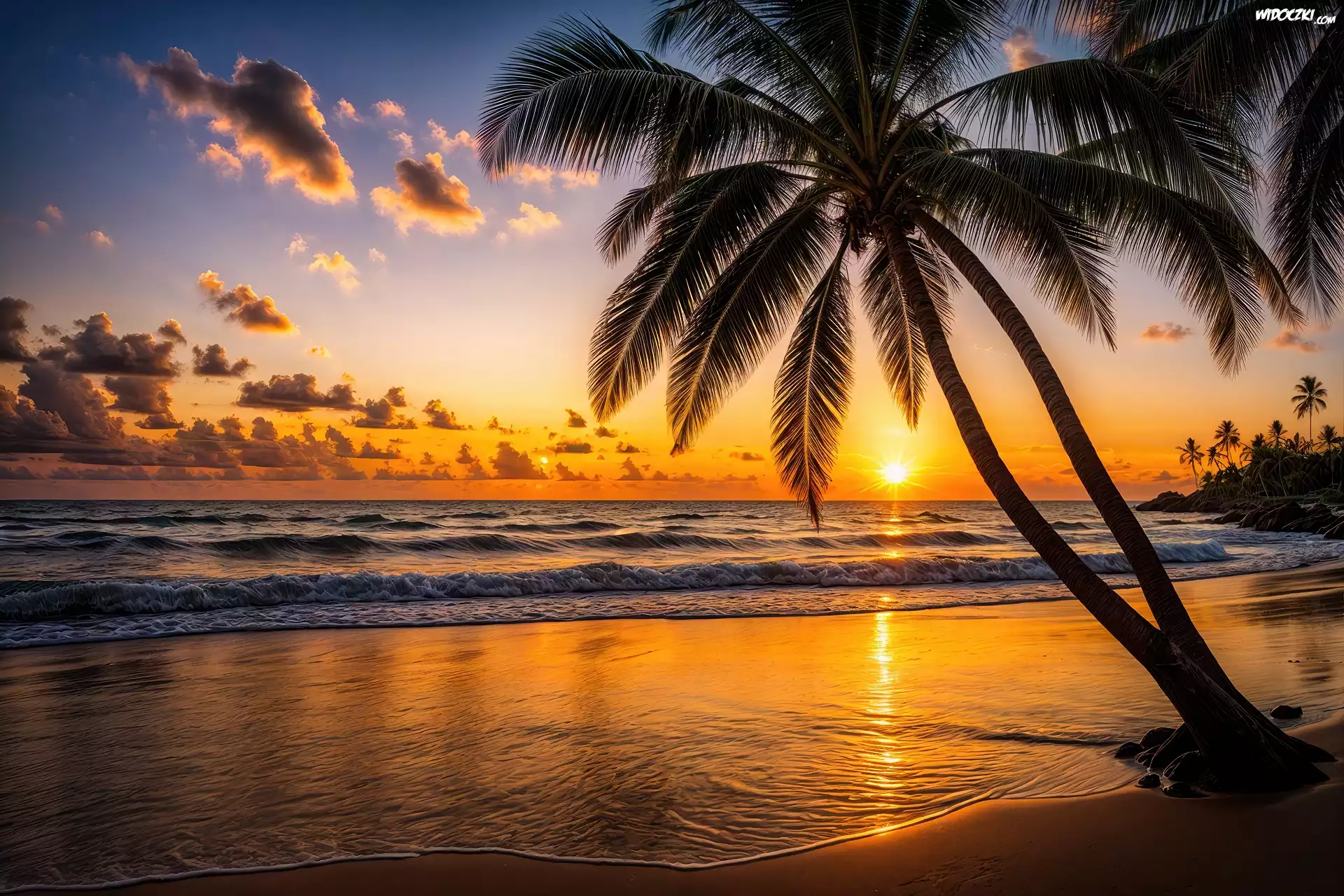 Zdjęcia, Plaża, Palmy, Morze, Zachód słońca, Grafika