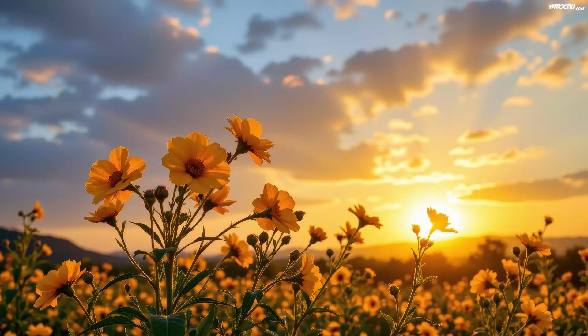 Zdjęcia, Żółte, Kwiaty, Niebo, Zachód słońca, Grafika