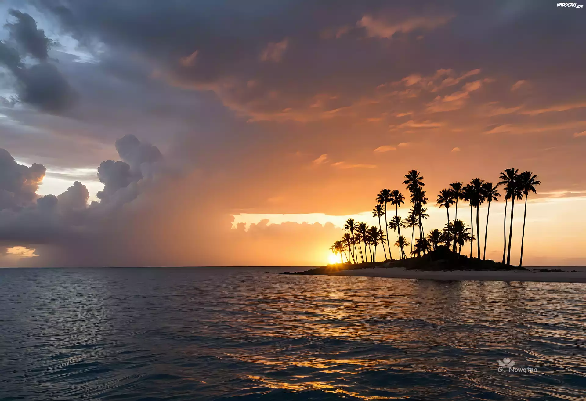Zdjęcia, Ocean, Wyspa, Palmy, Zachód słońca, Grafika