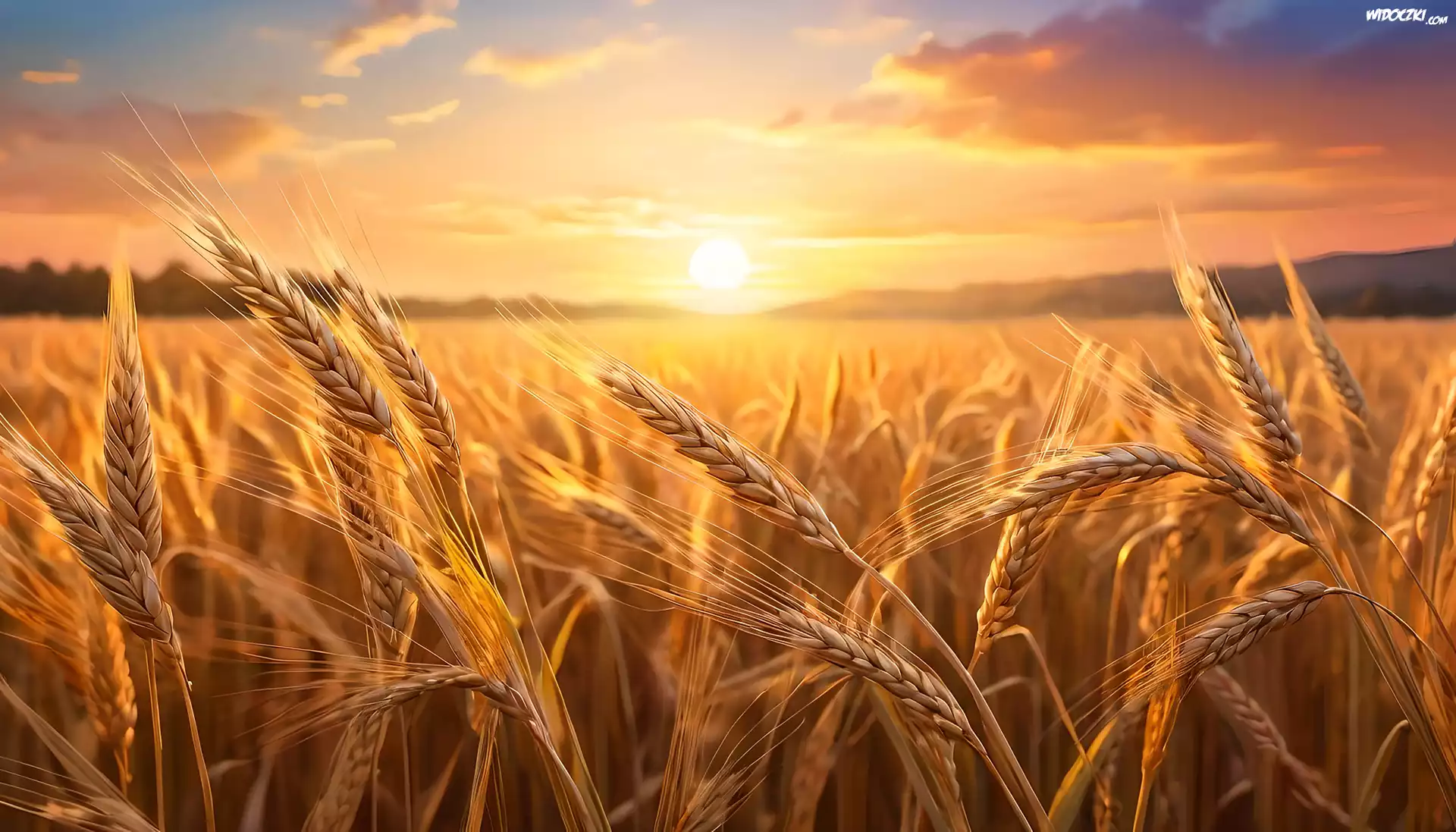 Zdjęcia, Kłosy, Zboże, Pole, Zachód słońca, Grafika