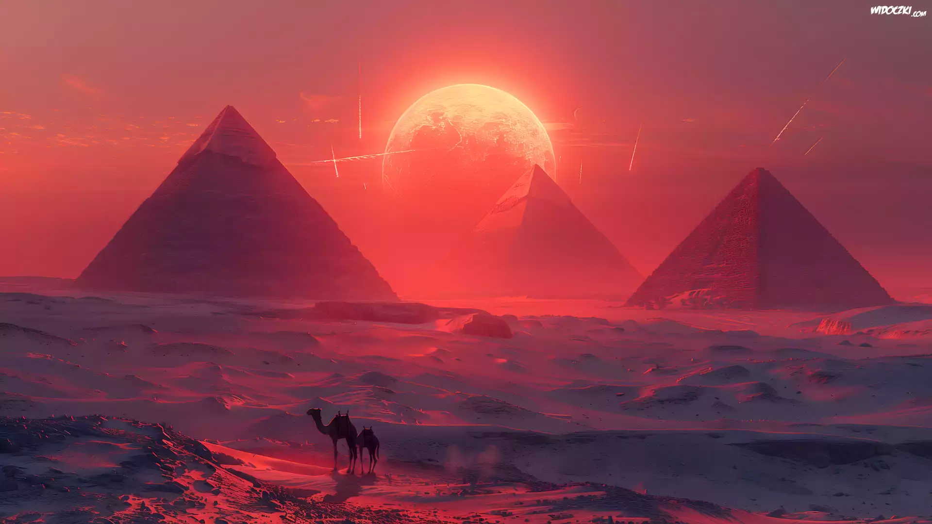 Piramidy, Wielbłądy, Pustynia, Zachód słońca, Grafika