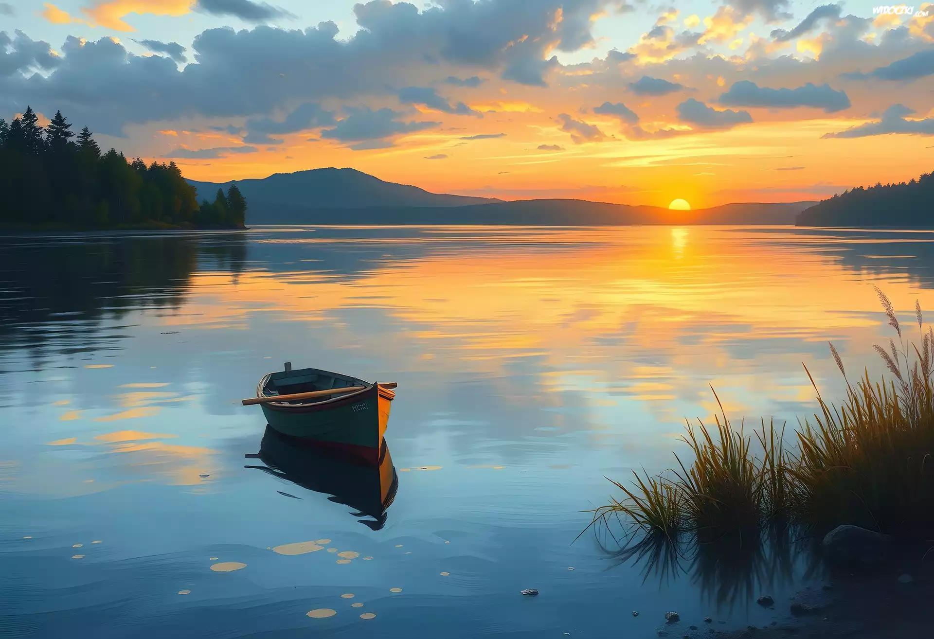 Zdjęcia, Jezioro, Łódka, Trzciny, Zachód słońca, Grafika