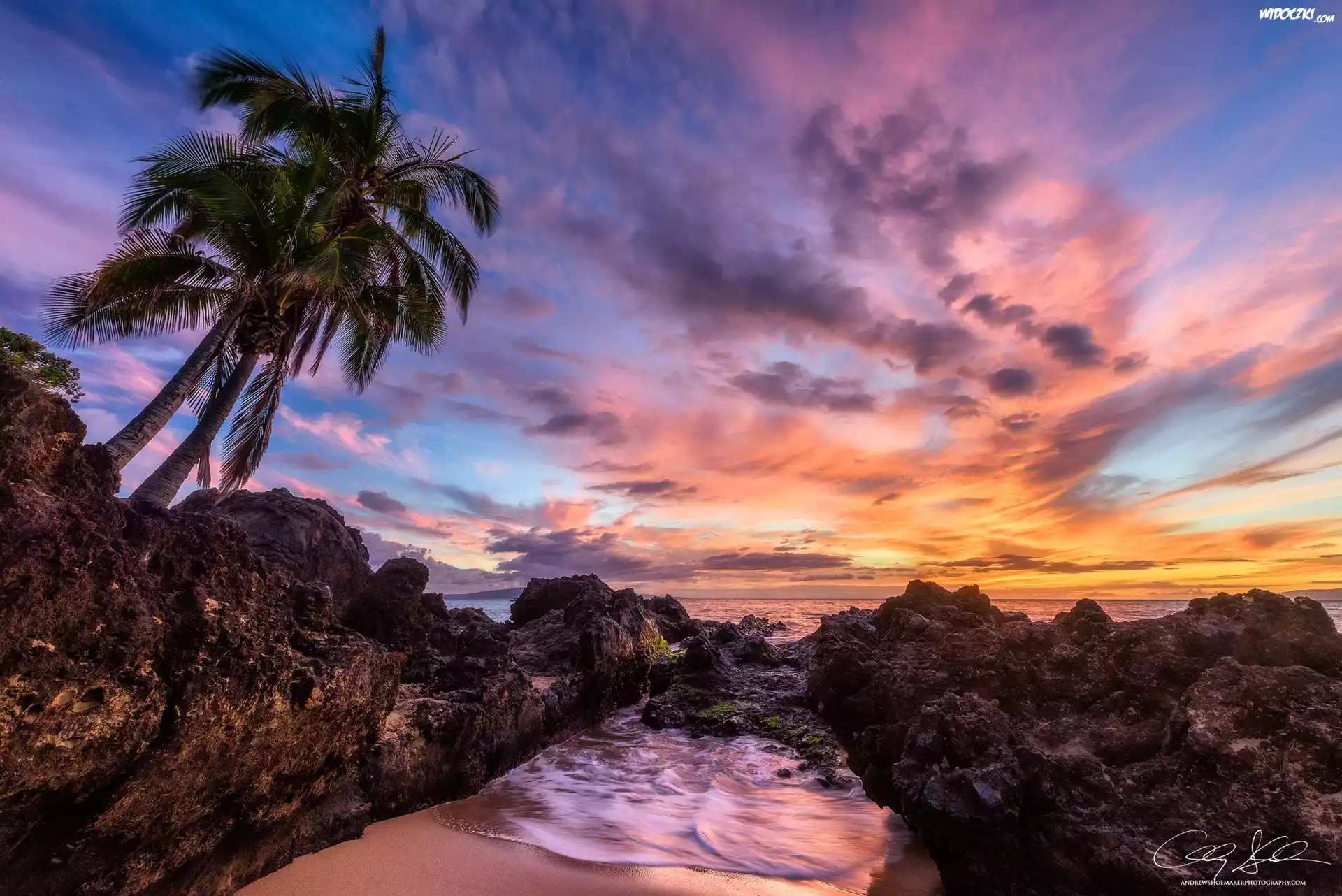 Hawaje, Zachód słońca, Morze, Palmy, Chmury, Skały