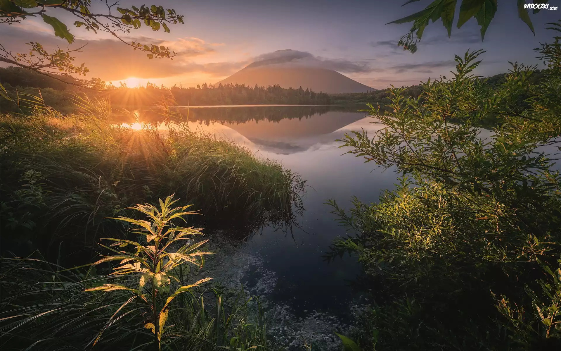 Stratowulkan, Atsonupuri, Góra, Zachód słońca, Jezioro, Wyspy Kurylskie, Wyspa Iturup, Obwód sachaliński, Rosja |