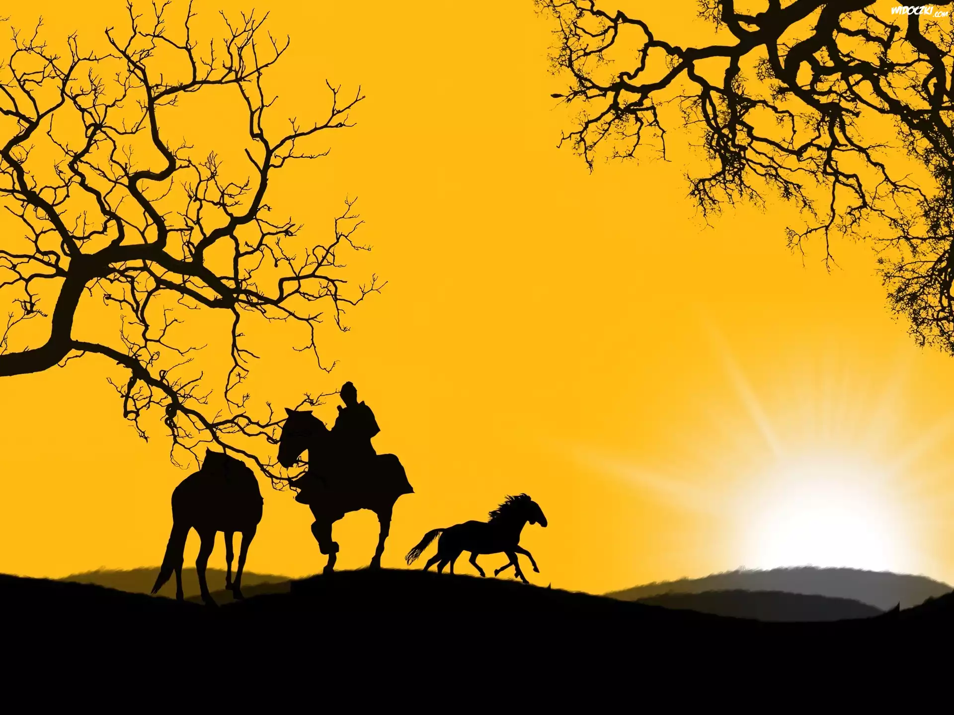Zachód, Słońca, Jeździec, Konie