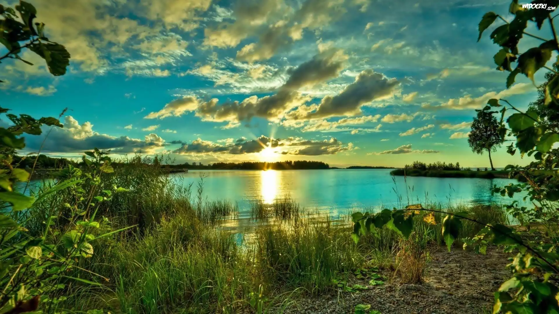 Zdjęcia, Zachód Słońca, Brzeg, Jezioro, Chmury