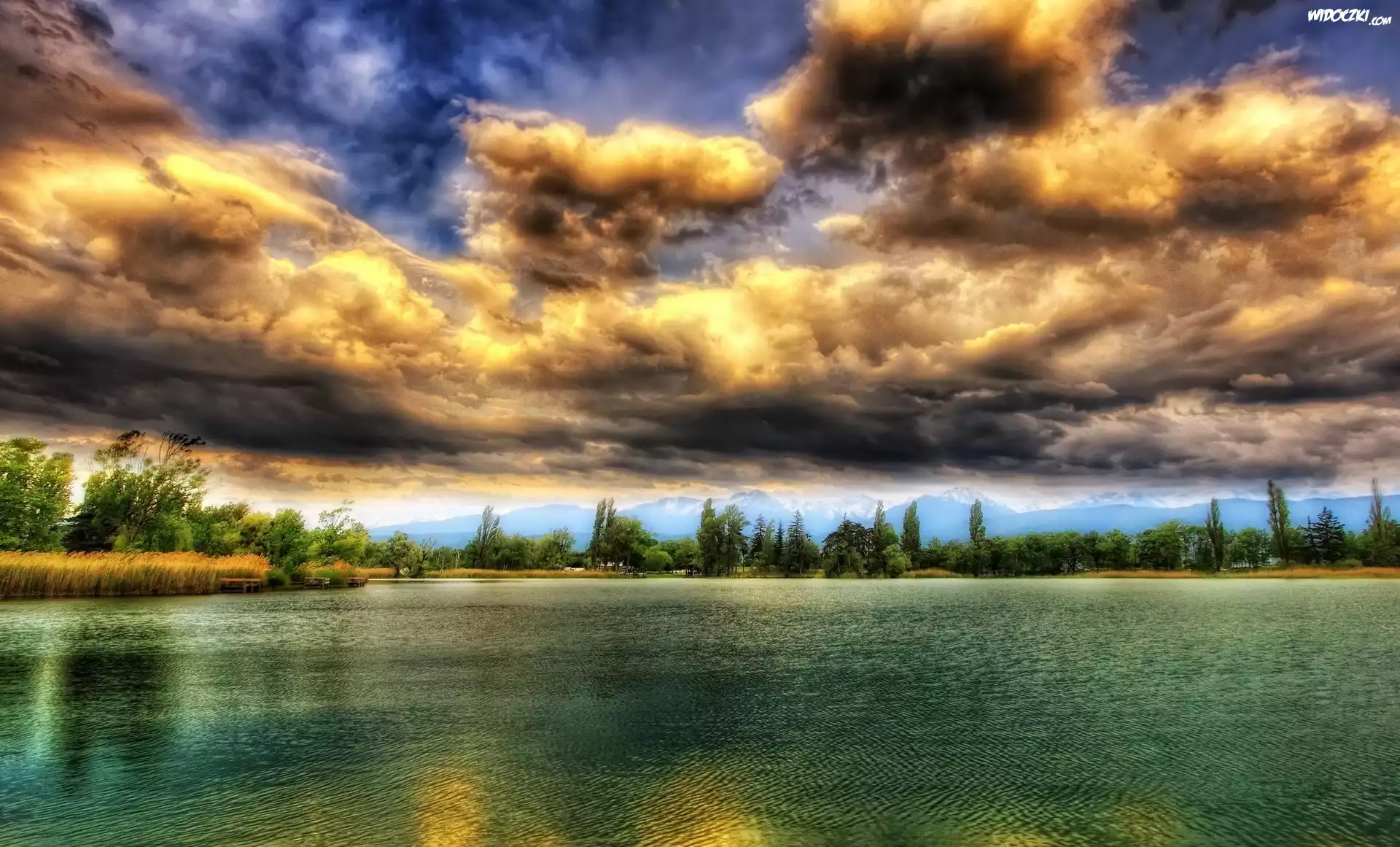 Zachód, Słońca, Chmury, Jezioro, Drzewa