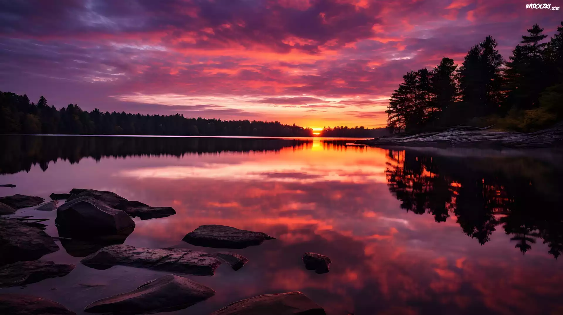 Zdjęcia, Kamienie, Drzewa, Jezioro, Zachód słońca, Grafika AI