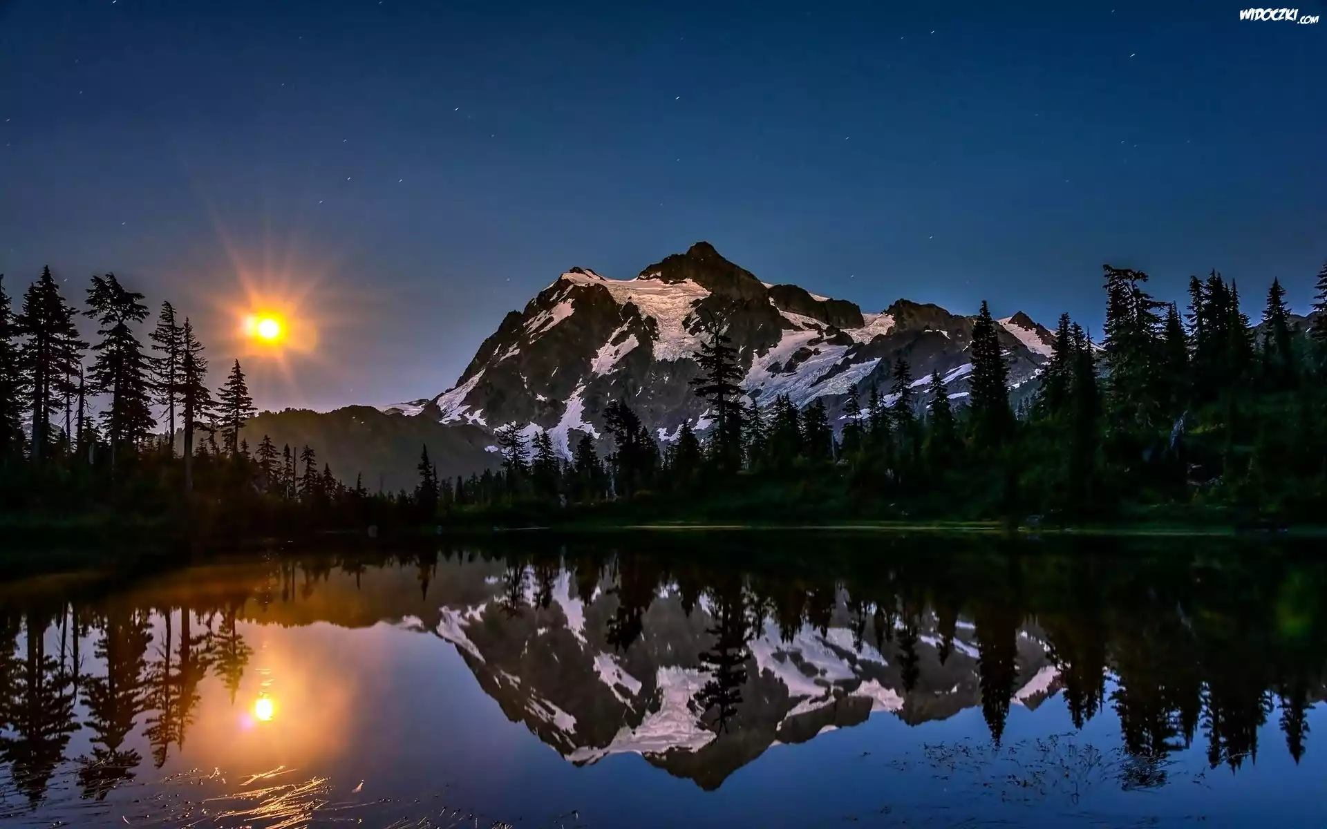 Zdjęcia, Zachód Słońca, Góry, Jezioro, Drzewa