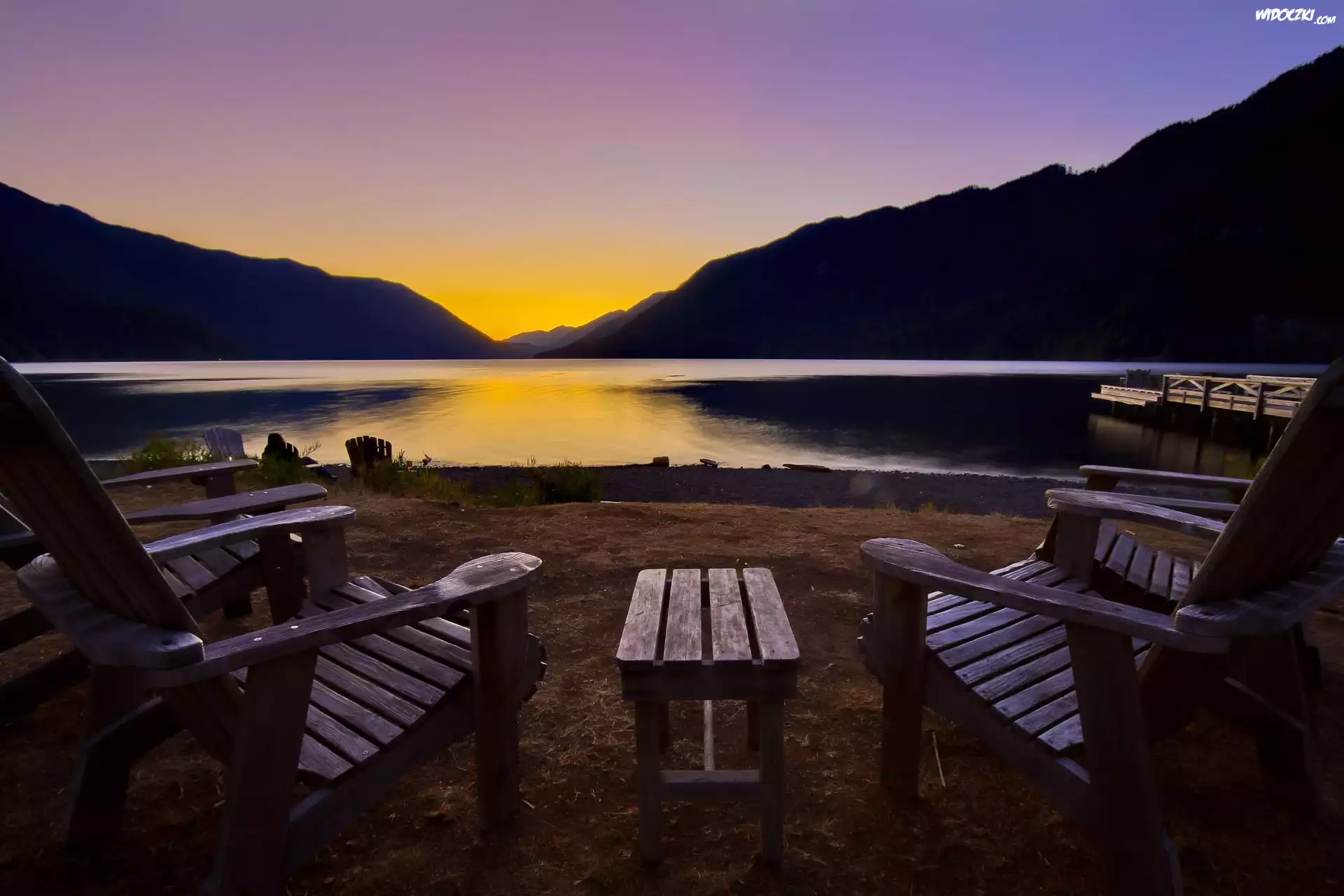Zdjęcia, Zachód, Słońca, Góry, Jezioro, Krzesła